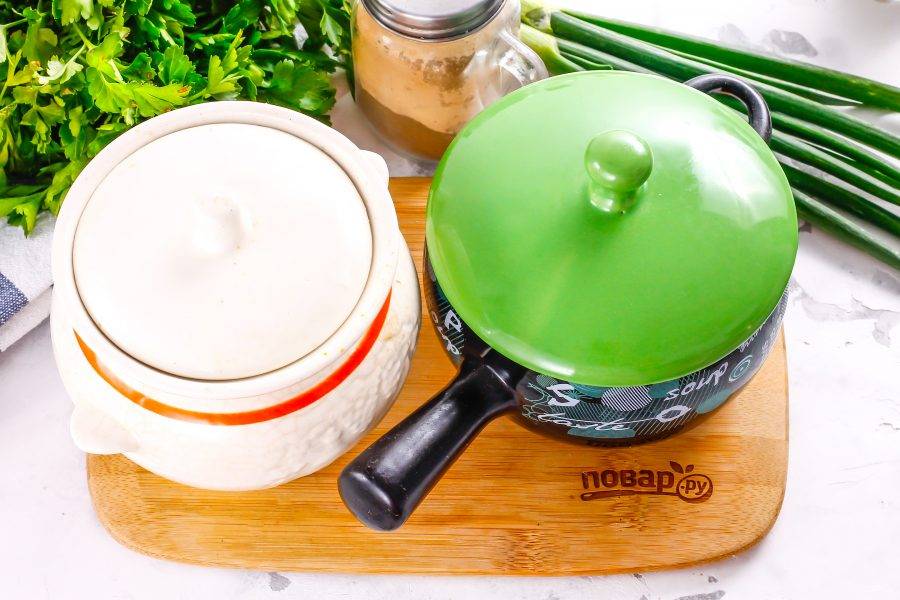 Накройте горшочки крышками или фольгой, поместите в духовку на 15 минут. Аккуратно извлеките после запекания, чтобы не обжечься.
