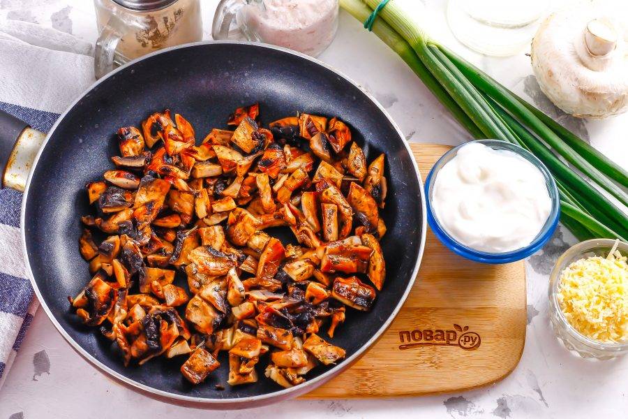 Шампиньоны нарежьте кубиками, ломтиками и обжарьте на растительном масле в сковороде. Если вместо зеленого лука вы будете использовать репчатый, то его также обжарьте вместе с грибами.