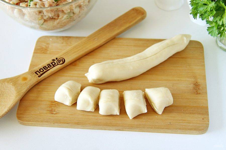 Теперь возьмите тесто и отрежьте от него кусок. Остальное опять накройте, чтобы не подсохло и оставьте ждать своей очереди. Из куска теста скатайте жгут и раскатайте его примерно до 2 см. толщиной. Чем тоньше получится жгут, тем тоньше будут пельмешки. Нарежьте его на кусочки одного размера.
