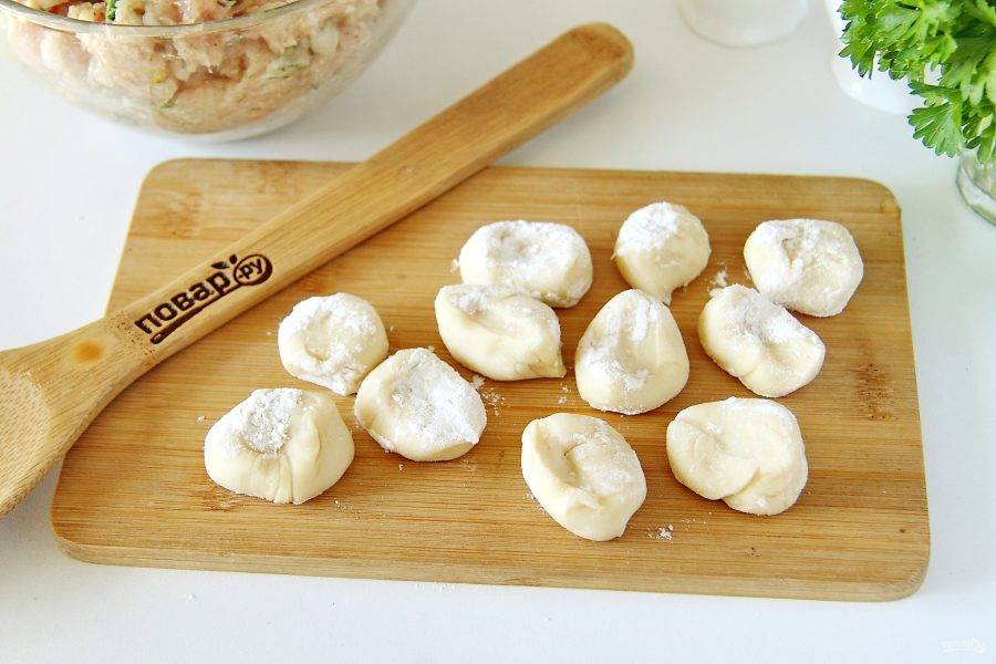 Затем раскатайте скалкой в форме круга или просто руками сформируйте лепешку. В центр выложите фарш.
