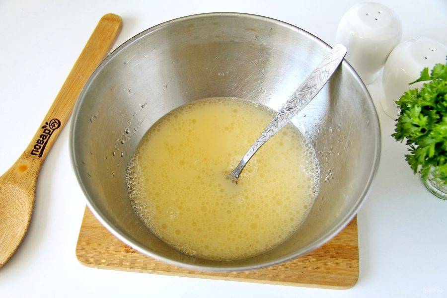 Соедините в глубокой миске яйцо, воду и растительное масло. Добавьте 0,5 ч.л. соли и все хорошо перемешайте.