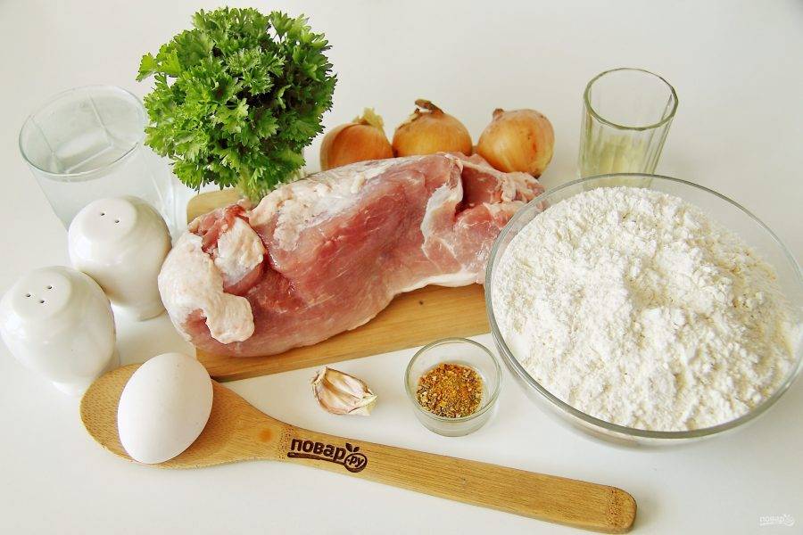 Тем временем приготовьте начинку. Мясо измельчите при помощи мясорубки, добавьте к фаршу нарезанный мелкими кубиками лук, измельченную зелень, пропущенный через пресс чеснок, соль по вкусу, любимые специи и 50 мл. холодной воды для сочности. Хорошо все перемешайте.
