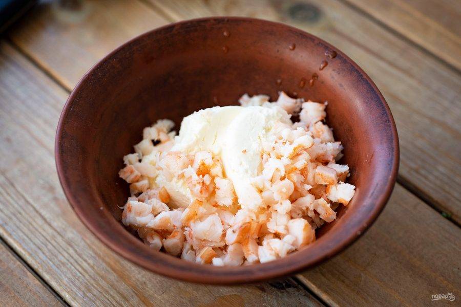 Теперь приготовьте начинку — это быстро. Ножом мелко нарежьте креветки.