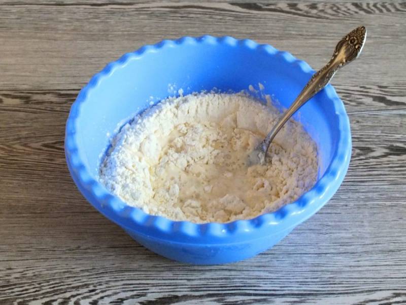 В чашу перелейте воду с яйцом. Добавьте муку. Всыпьте сначала меньшую часть. Перемешайте вилкой. Если тесто хорошо собралось в комок, добавьте растительное масло и замесите тесто. По необходимости добавляйте муку. Тесто должно получиться мягким, но не липнущим к рукам.