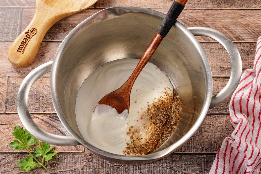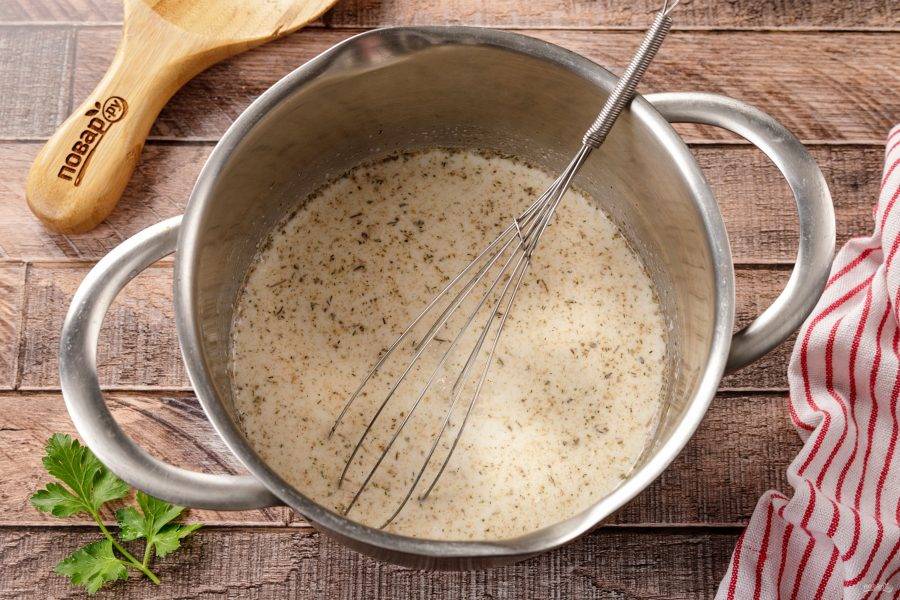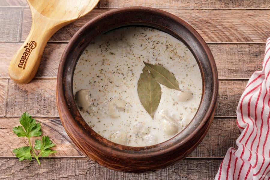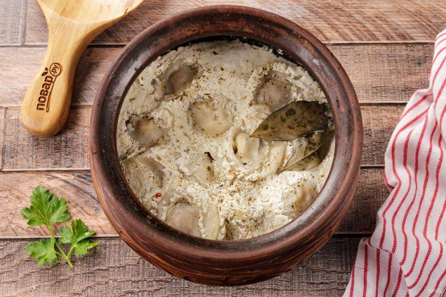 Залейте пельмени соусом. Добавьте лавровый лист.