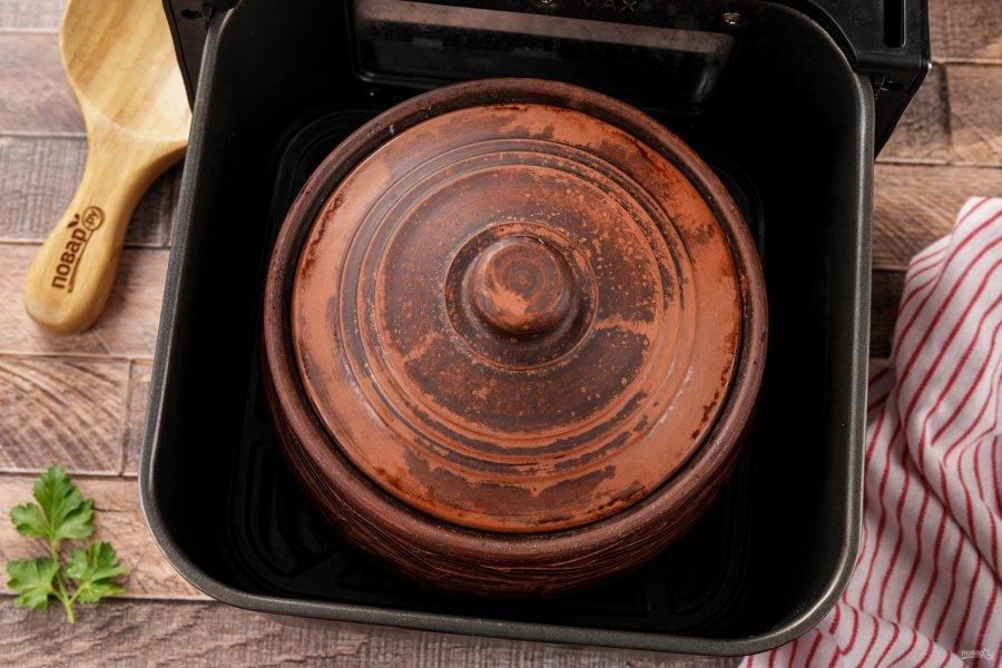 Накройте крышкой и поместите в чашу аэрогриля. Готовьте при температуре 200 градусов 40 минут. Затем не открывая дайте постоять ещё 5-10 минут.