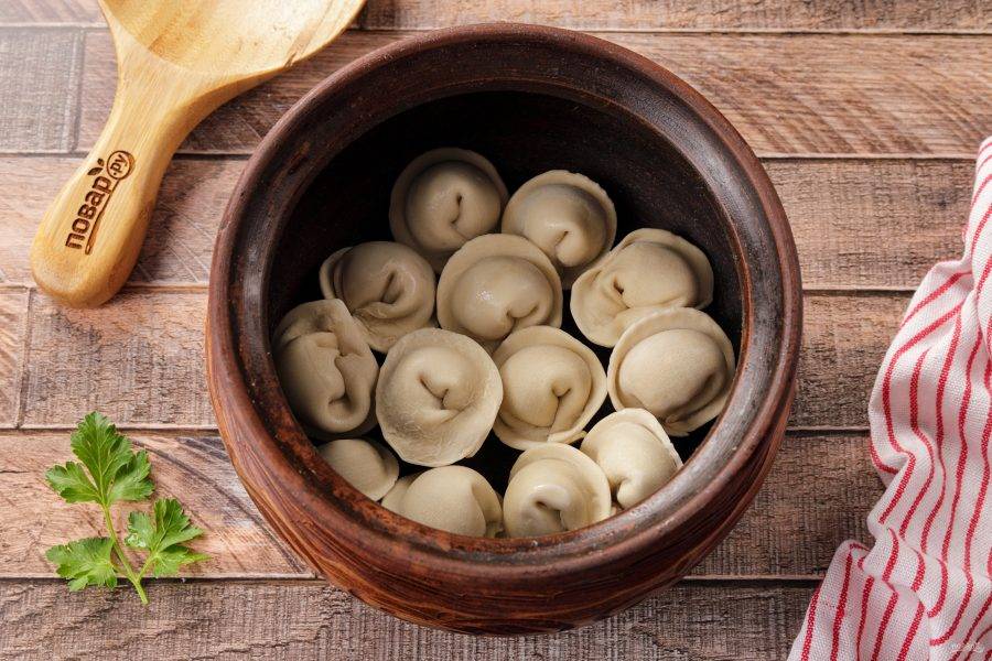 Готовые пельмени вместе с соусом выложите в порционные тарелки и подавайте к столу горячими. Приятного аппетита!