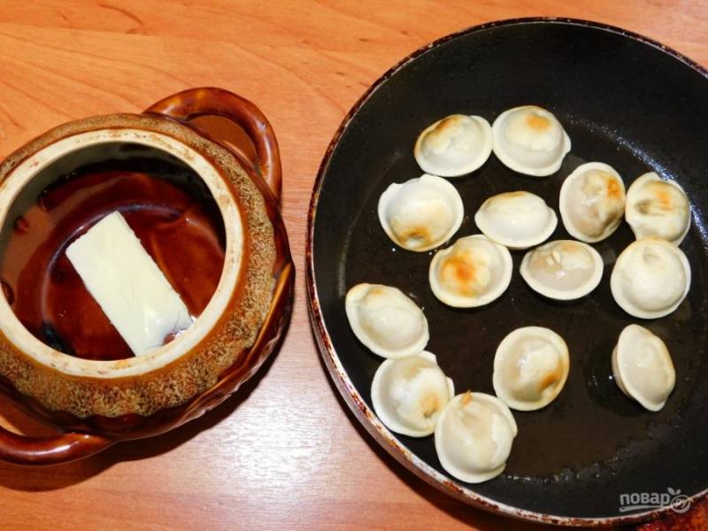 Обжарьте пельмени на горячей сковороде. В горшочки или форму для запекания положите небольшой кусочек сливочного масла. Затем выложите обжаренные пельмени.