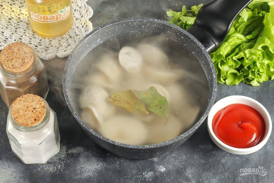 Вскипятите воду в казане, ковше или кастрюле. Всыпьте соль и лавровые листья. Выложите в кипящую воду замороженные пельмени по одному и отварите на умеренном нагреве 8 минут. Если у вас электрическая панель, то примерно 10-11 минут.