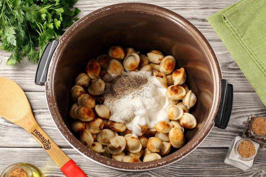 Пельмени в сметане в мультиварке готовы. Перемешайте и подавайте к столу.