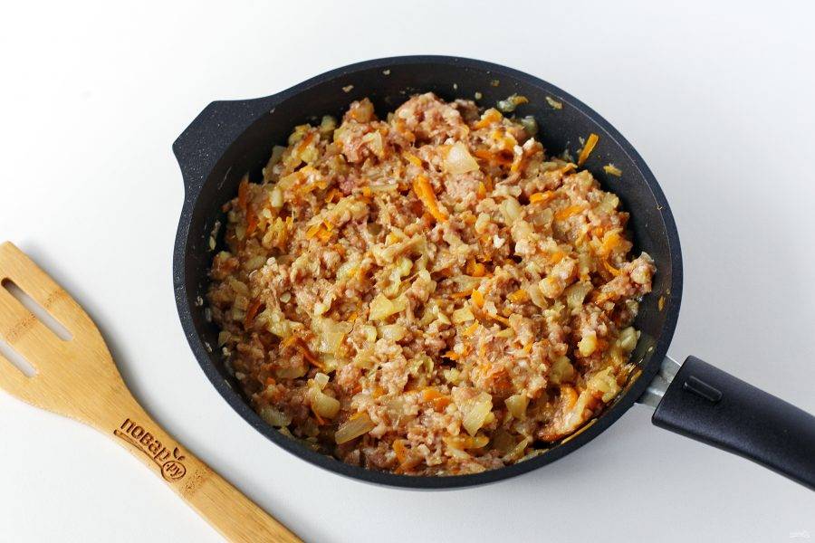 Затем снимите с огня и добавьте фарш. Перемешайте все до однородности. Начинка готова.