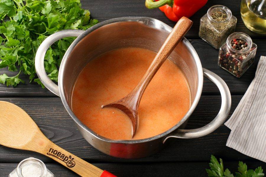Приготовьте соус для тушения перцев. Соедините сметану, томатную пасту и воду. Отрегулируйте на соль и перемешайте. Можно добавить 1 ст.л. муки, чтобы соус приобрёл бархатистость и щепотку-две сахара, для более сбалансированного вкуса.