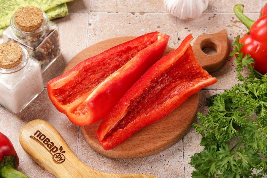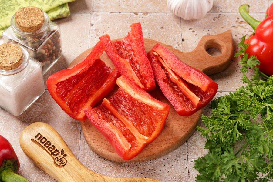 У перцев срежьте верхушки и удалите сердцевину с семенами. Промойте перцы под проточной водой и обсушите.
