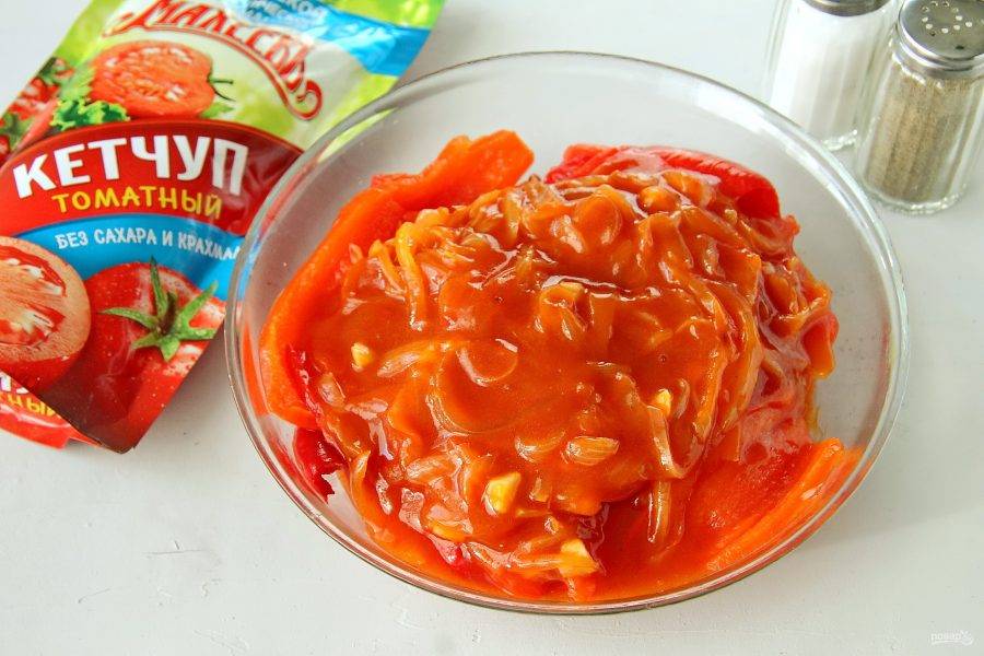 Затем добавьте кетчуп и измельченный ножом чеснок.