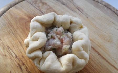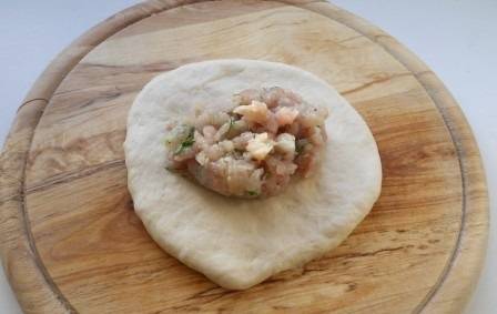 Раскатайте кусочки теста в лепешки, в середину каждой вложите одну столовую ложку фарша.