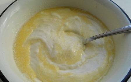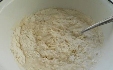 Полученную смесь перелейте в глубокую миску, добавьте просеянную муку. В середине сделайте углубления, влейте туда дрожжевую смесь. Аккуратно перемешайте.