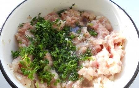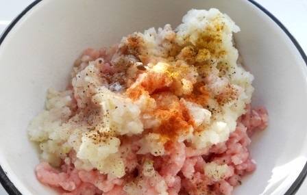 Приготовим начинку. Смешайте с фаршем перекрученный на мясорубке лук, посолите, поперчите и добавьте карри.