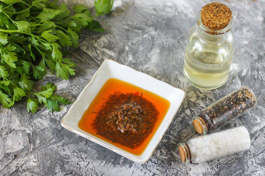 Приправы и специи измельчите, смешайте с растительным маслом без запаха. Количество соли добавляйте исходя из вкуса приправы для курицы. Зачастую в приправе соль уже присутствует!