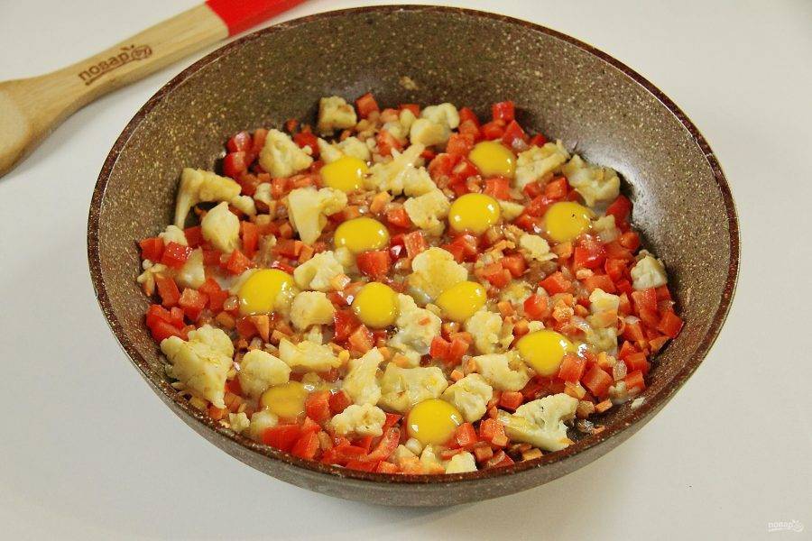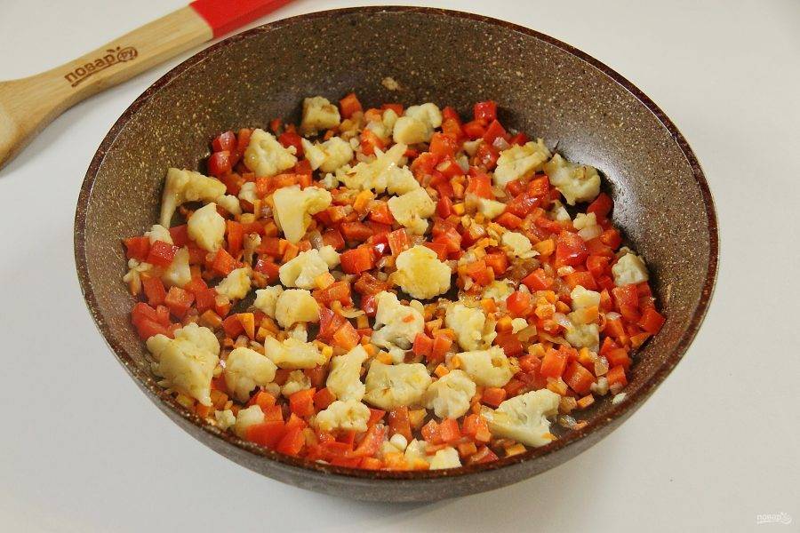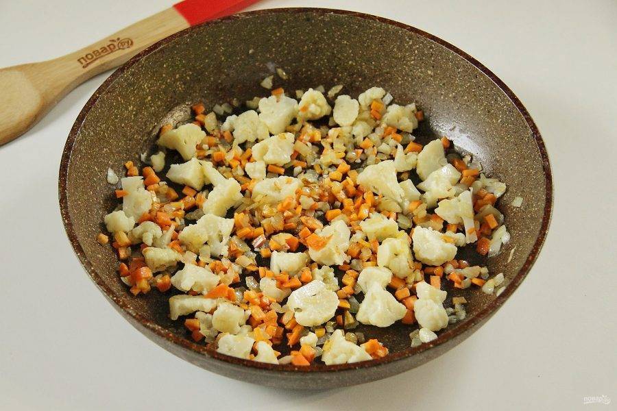 Соцветия цветной капусты разрежьте на несколько частей, добавьте в сковороду и обжарьте все вместе несколько минут.