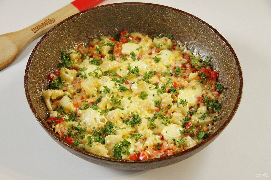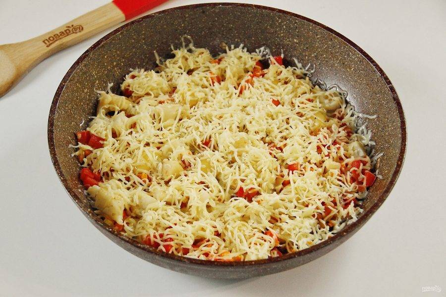 Посыпьте сверху все тертым сыром, накройте сковороду крышкой и на небольшом огне готовьте около 5 минут.