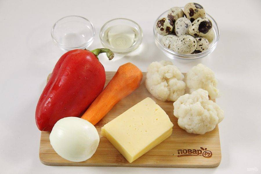 Подготовьте все ингредиенты. Цветную капусту заранее отварите в подсоленной воде до полуготовности, залейте холодной водой на пару минут и остудите.