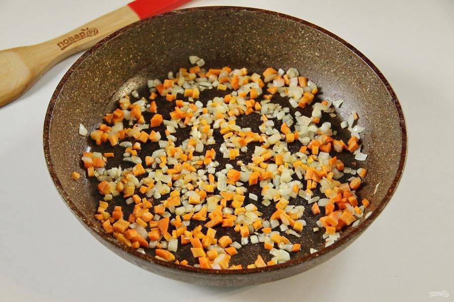 Лук и морковь нарежьте кубиками и обжарьте до мягкости.