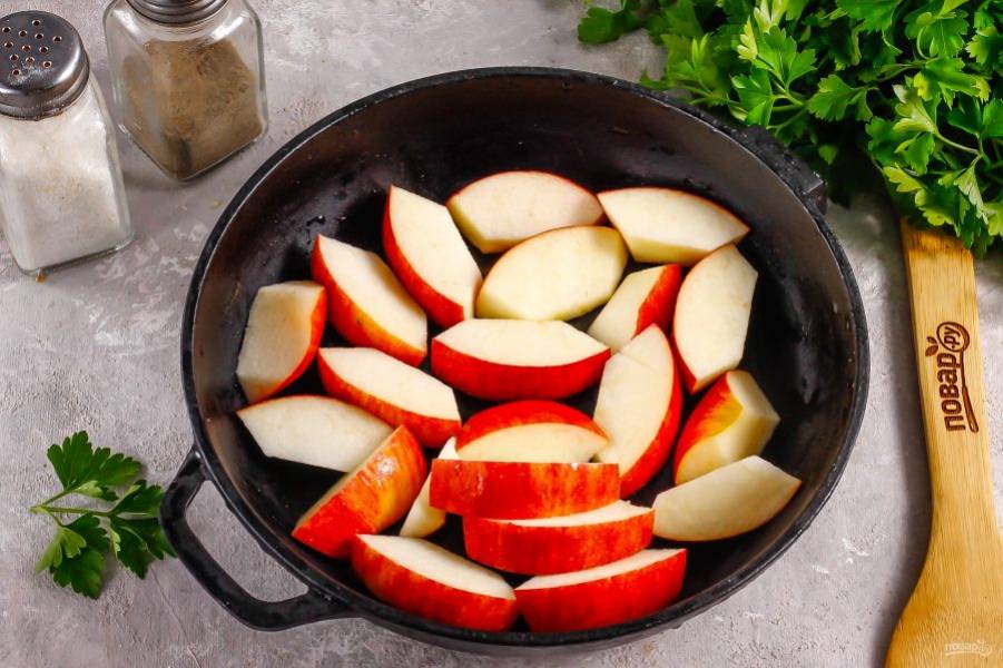 Яблоки промойте в воде и разрежьте. Вырежьте из них семенные блоки и нарежьте ломтиками. Выложите в форму для запекания.