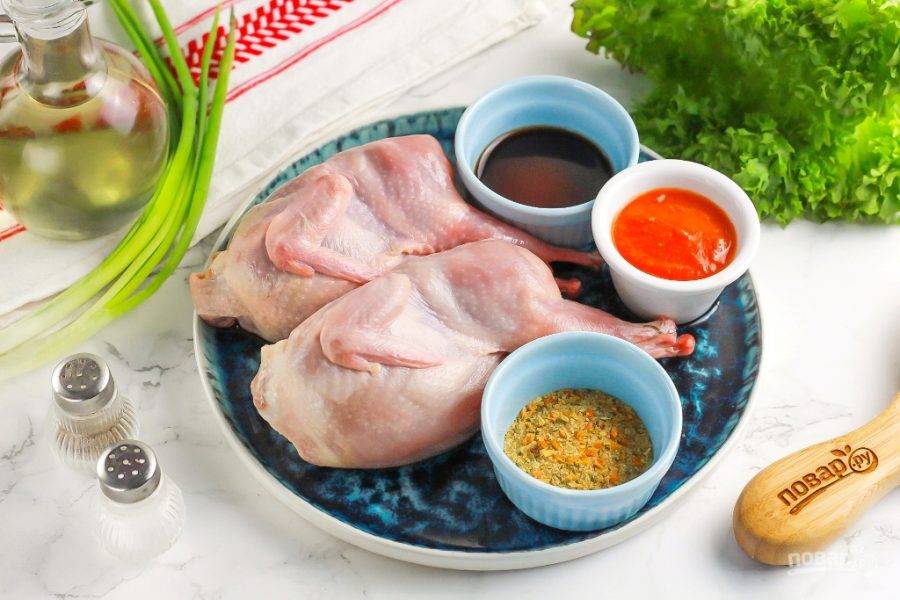 Выложите тушки в глубокую емкость, добавьте аджику, соевый соус, соль, молотый черный перец и растительное масло. Тщательно все перемешайте, чтобы перепела обволоклись маринадом. Не добавляйте лук и чеснок, крупно измельченные приправы — они подгорят. Оставьте перепелов в маринаде минимум на 30 минут, максимум — на ночь.