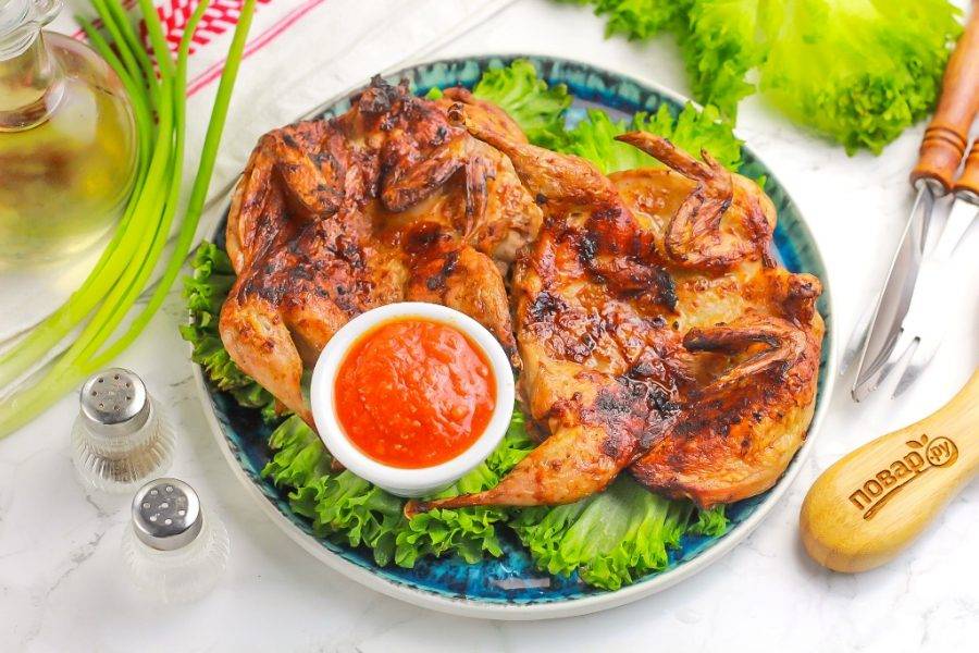 Выложите аппетитные перепела из аэрогриля на тарелку и подайте к столу с соусом, салатом, любым другим гарниром. Приятного вам аппетита!