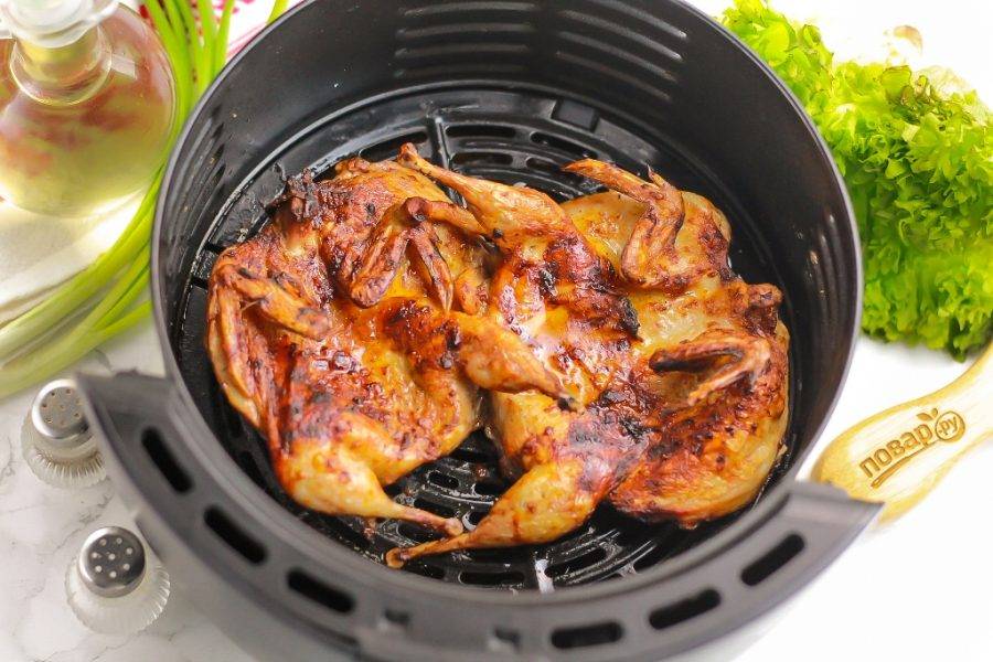 Чтобы подать к столу аппетитных и румяных запеченных перепелок, необязательно использовать духовку. С такой задачей отлично справится аэрогриль. Маринуйте перепелок в любимом соусе и запекайте!
