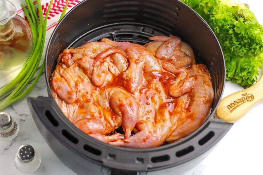 Смажьте поддон аэрогриля растительным маслом и выложите в него тушки кожей вверх, так как в аэрогриле вертикальный нагрев.