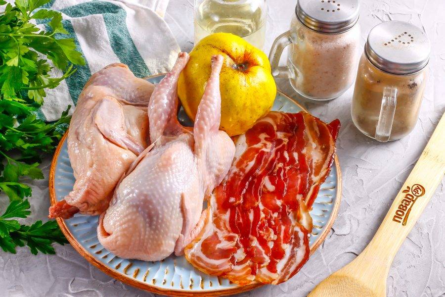 Подготовьте указанные ингредиенты. Бекон можно использовать свежий либо копченый, а вместо айвы — яблоко.