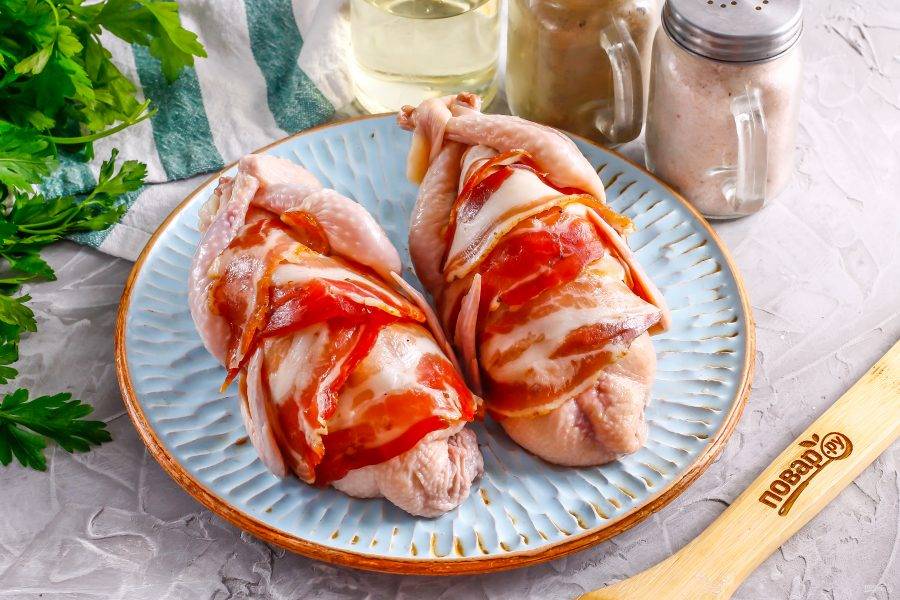 Обверните тушки беконом. Можно полностью обвернуть, можно только сверху.