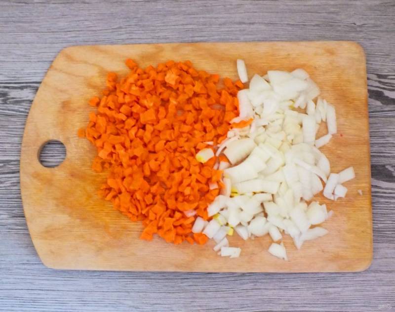 Подготовьте овощи. Морковь и лук нарежьте мелкими кубиками.