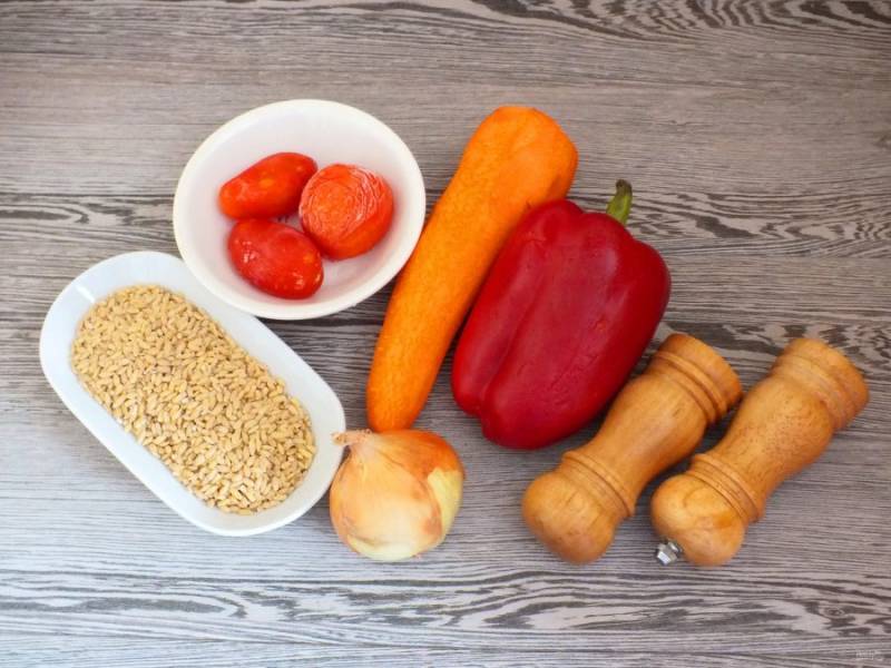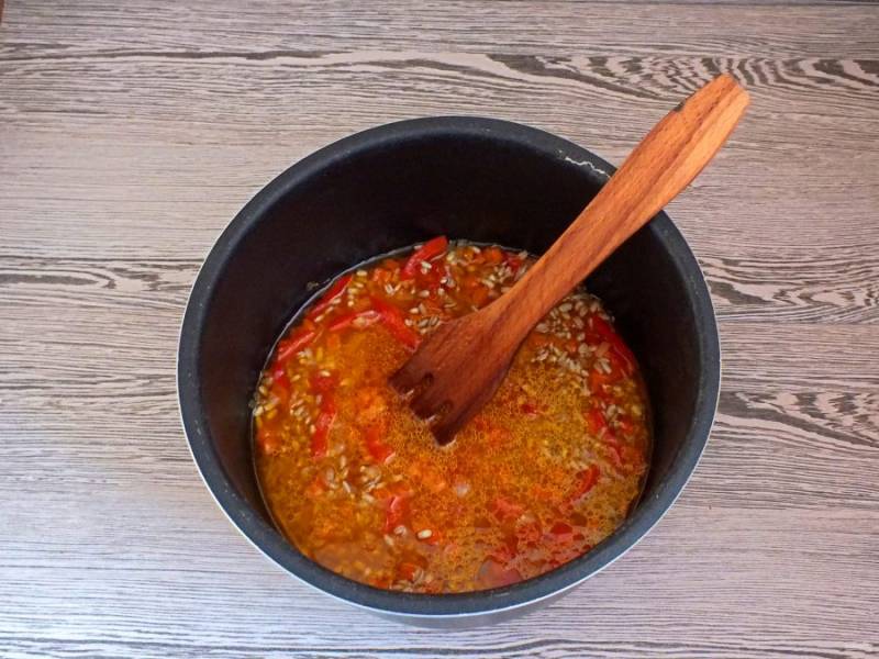 Добавьте нарезанные перец и помидоры. Обжарьте с открытой крышкой мультиварки в течение 5-7 минут. Отключите мультиварку. Добавьте перловку, 3 ст. воды. Перемешайте. Вода, обязательно должна покрывать крупу. Выставите режим "Выпечка" по времени 45 минут повторно, закройте крышку.