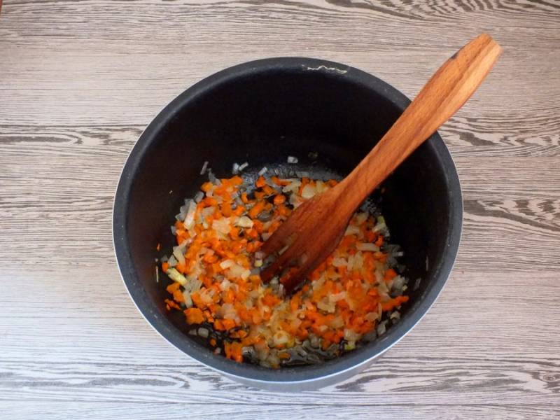 В чаше мультиварки, на режиме "Выпечка", разогрейте растительное масло. Обжарьте в нем морковь с луком до мягкости.