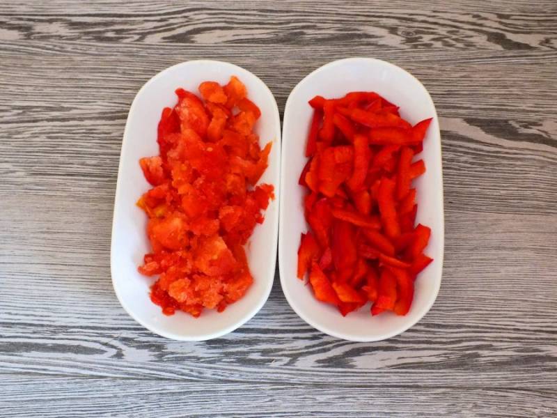 С помидоров снимите кожицу. С замороженных она снимается без проблем. Или используйте свежие помидоры, залейте кипятком на 20 минут и после снимите. После нарежьте мелким кубиком. Перец нарежьте соломкой.