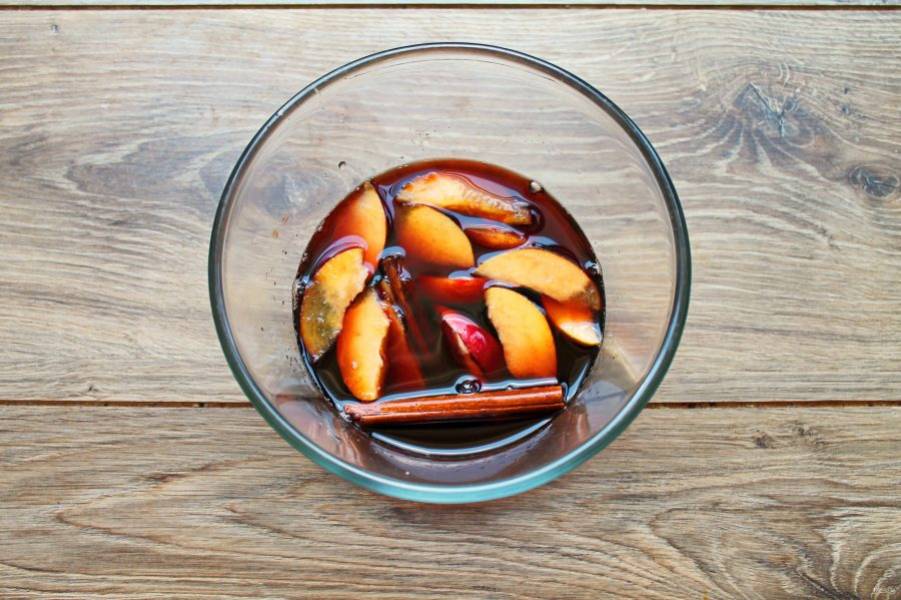 Персики вымойте, удалите косточки и порежьте на тонкие дольки, выложите в чашу. Добавьте к персикам палочки корицы.