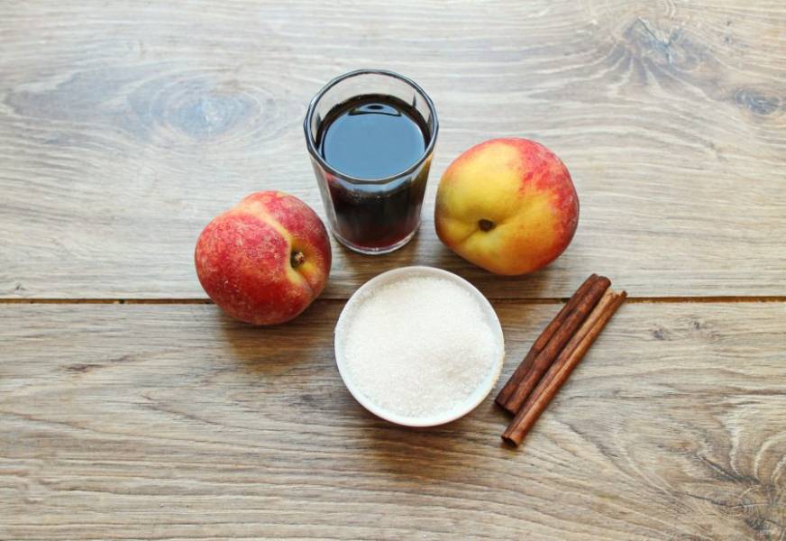 Подготовьте все необходимые ингредиенты для приготовления десерта из персиков в красном вине.