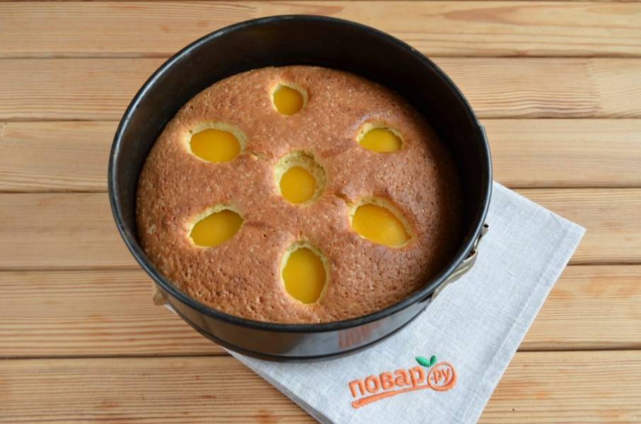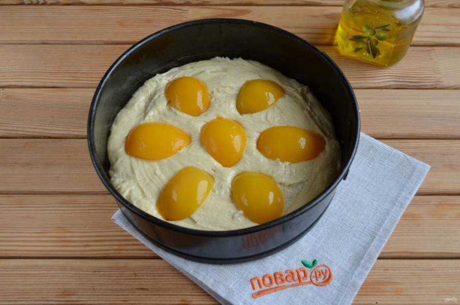 9. Половинки персиков порежьте на пополам. Разложите красиво на пироге, чуть вдавите их в тесто. Разогрейте духовку до 180 градусов. Поставьте пирог на 35 минут.