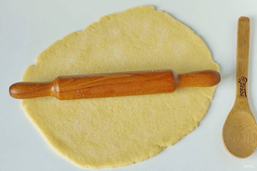 Затем раскатайте тесто в форме прямоугольника, толщиной около 5 мм. Посыпьте тесто сверху сахаром и пройдитесь по нему скалкой.