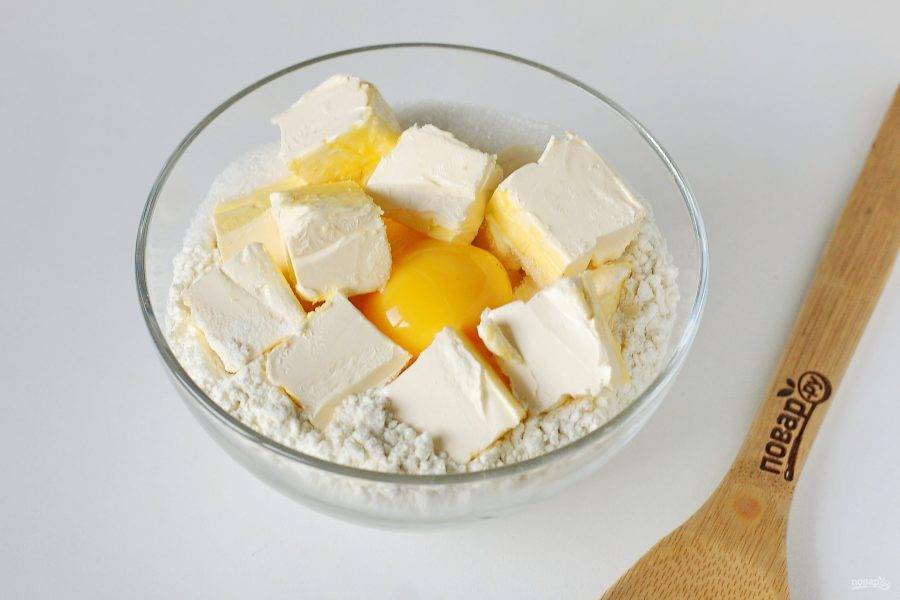 В глубокой миске соедините муку, нарезанное кубиками масло, сахар и желток.