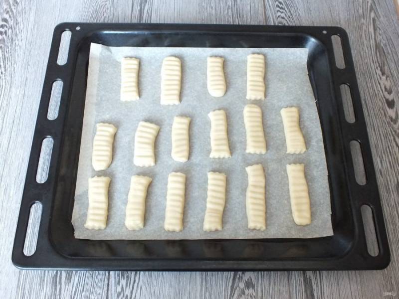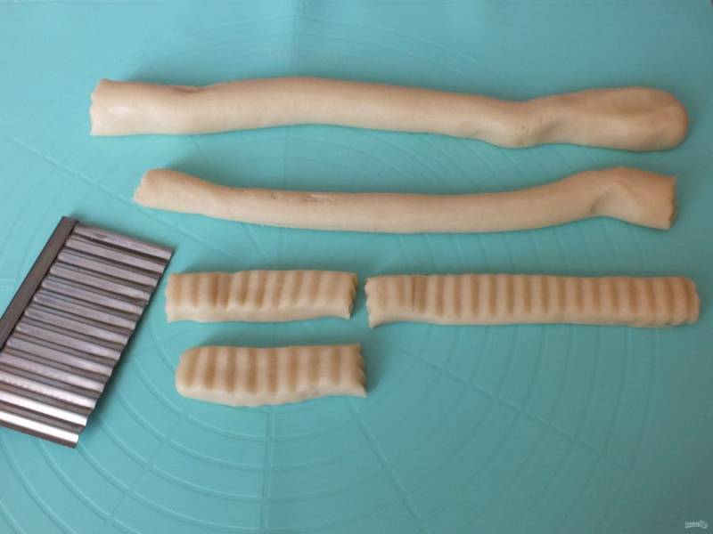 Тесто разделите на две половины. Подкатайте в жгуты. Каждый жгут еще разделите на 2 части. Разрежьте подготовленные жгуты на небольшие кусочки.