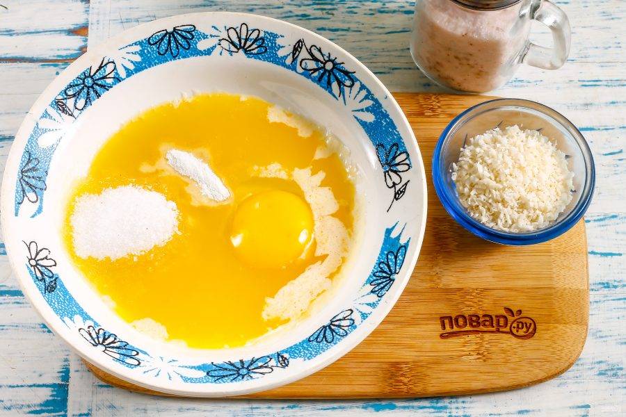 Слегка остудите масло, чтобы в нем не сварилось яйцо. Вбейте в емкость куриное яйцо, всыпьте сахар, соль, разрыхлитель. Взбейте все вилкой или венчиком.