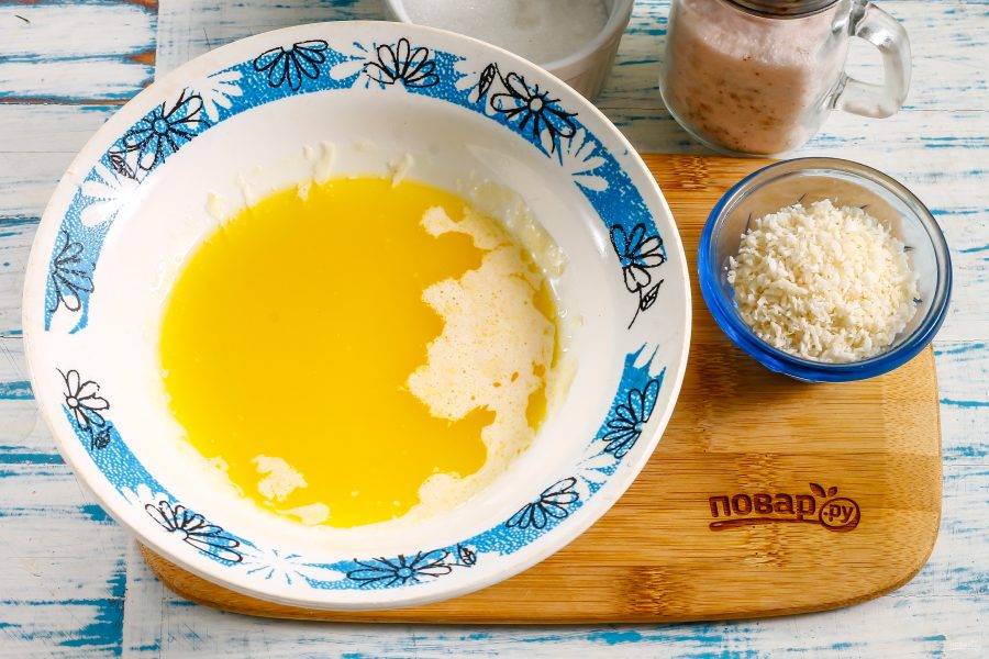 Растопите сливочное масло в микроволновке или на водяной бане, перелейте в глубокую емкость. Вместо масла можно использовать качественный маргарин, но не спред!