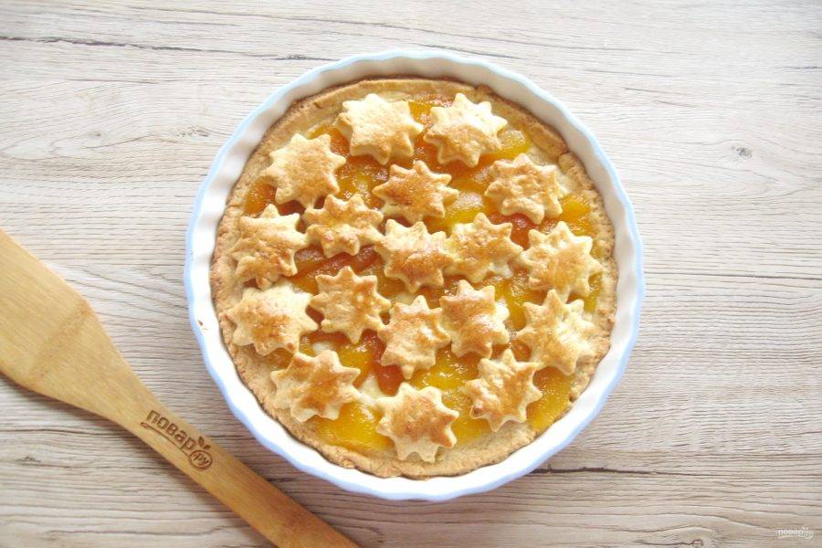 Раскатайте меньшую часть теста и при помощи кондитерской выемки вырежьте звёздочки или другие фигурки. Выложите поверх абрикосов.
