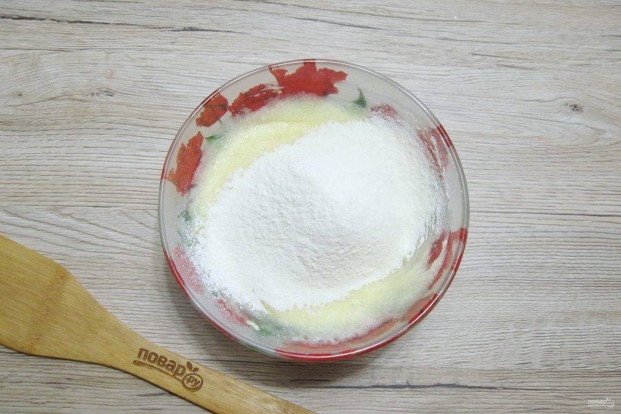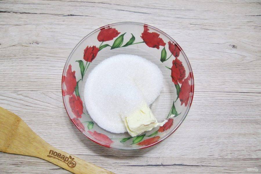 В глубокую миску всыпьте сахар и добавьте размягчённое масло. Хорошо перемешайте.