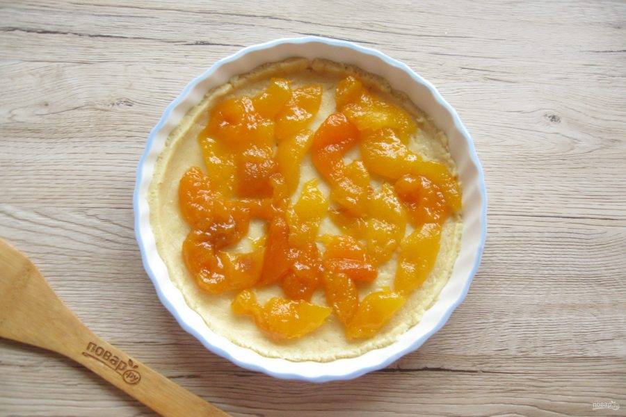 На тесто разложите абрикосы. Нарезанные или половинки. Они могут быть свежие, мороженные, консервированные или из варенья.