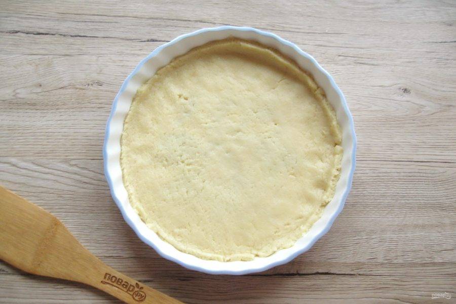 После разделите тесто на две неравные части. Большую часть раскатайте и выложите в форму для запекания, чтобы оставался небольшой бортик. Диаметр моей формы 20 см.