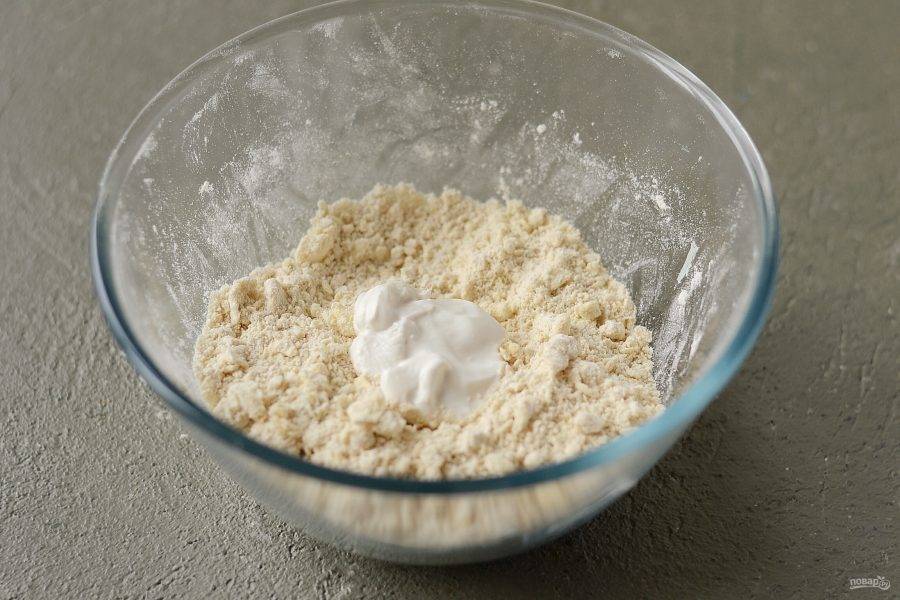 Смешайте муку, щепотку соли и разрыхлитель. Сливочное масло нарежьте кубиками. Руками разотрите масло с мукой в крошку.